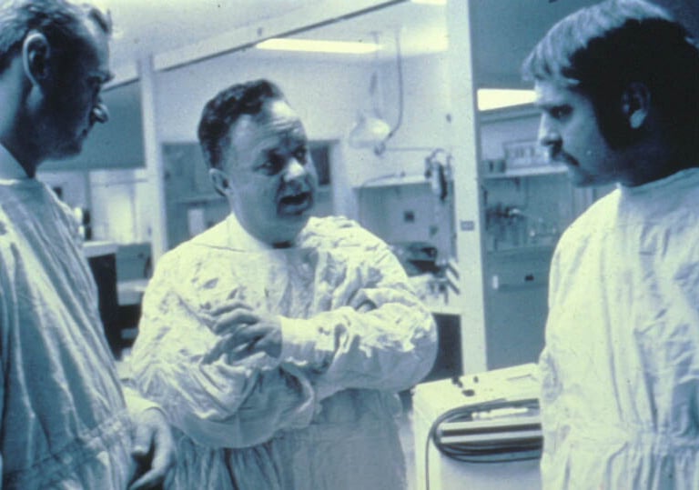 Dr. Cowley demonstrating a portable satellite station, 1977—advancing emergency medical communication.