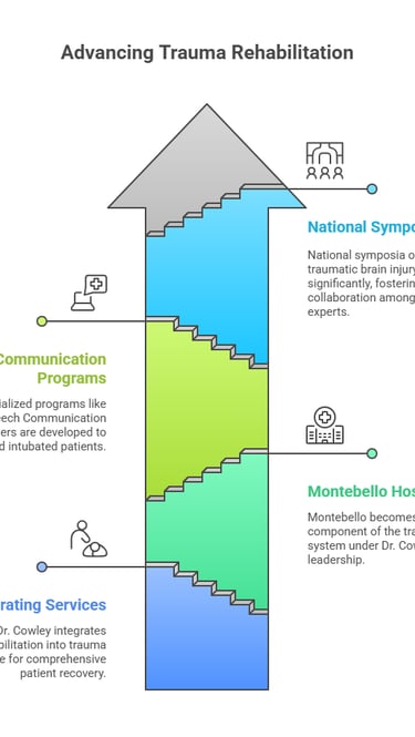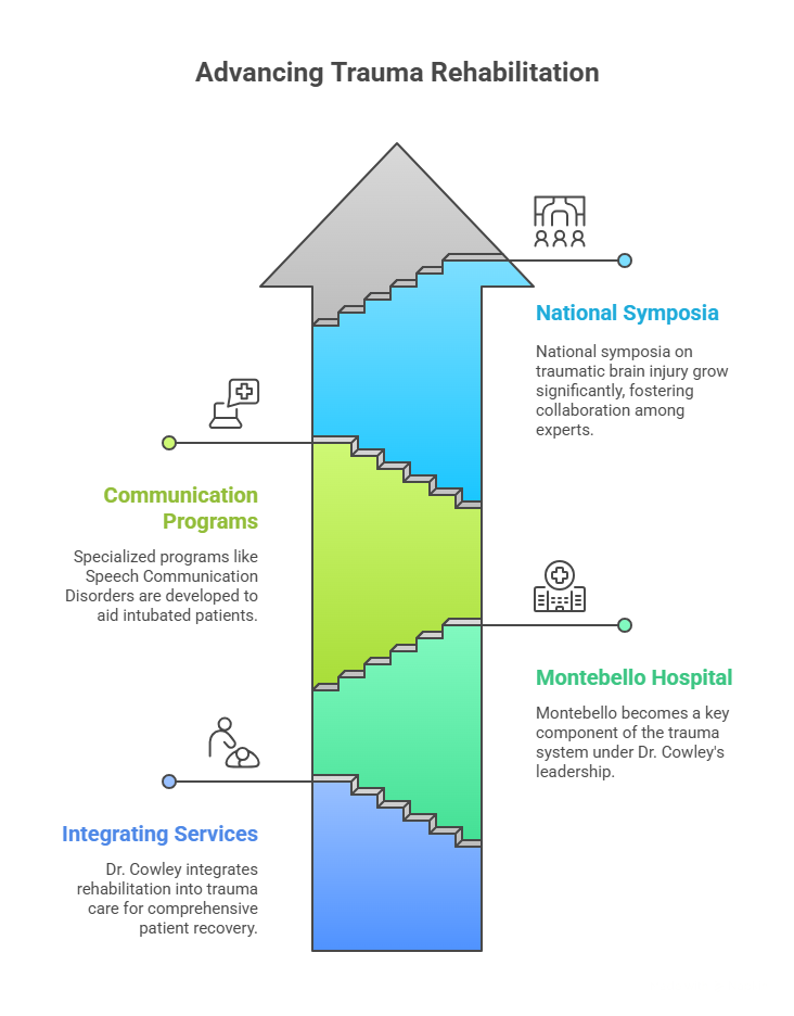This chart shows how Dr. Cowley advanced trauma rehabilitation—starting with integrated services, expanding through Montebello Hospital, and culminating in national symposia that united experts to push recovery science forward.